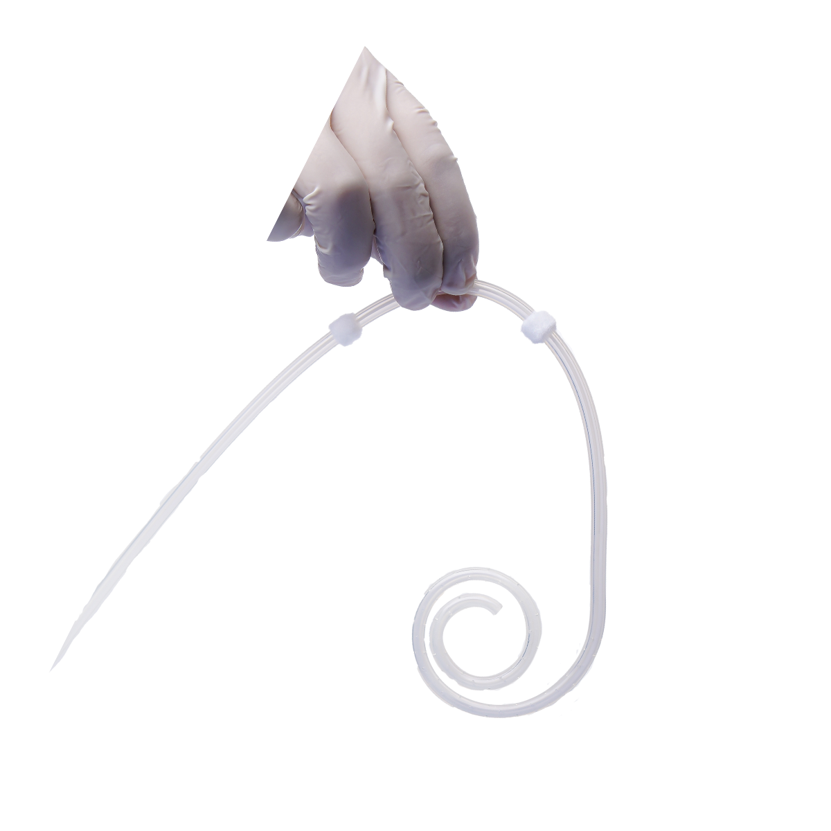 El catéter curvado de silicona, con doble cuff de poliéster, asegura la fijación del dispositivo, adicionando protección contra contaminación bacteriana y evitando las fugas cuenta con terminación curva espiral (cola de chancho, “Pig tail”) y orificios laterales (multiperforado) estratégicamente colocados que permiten un aumento del flujo y la reducción de la oclusión omental.